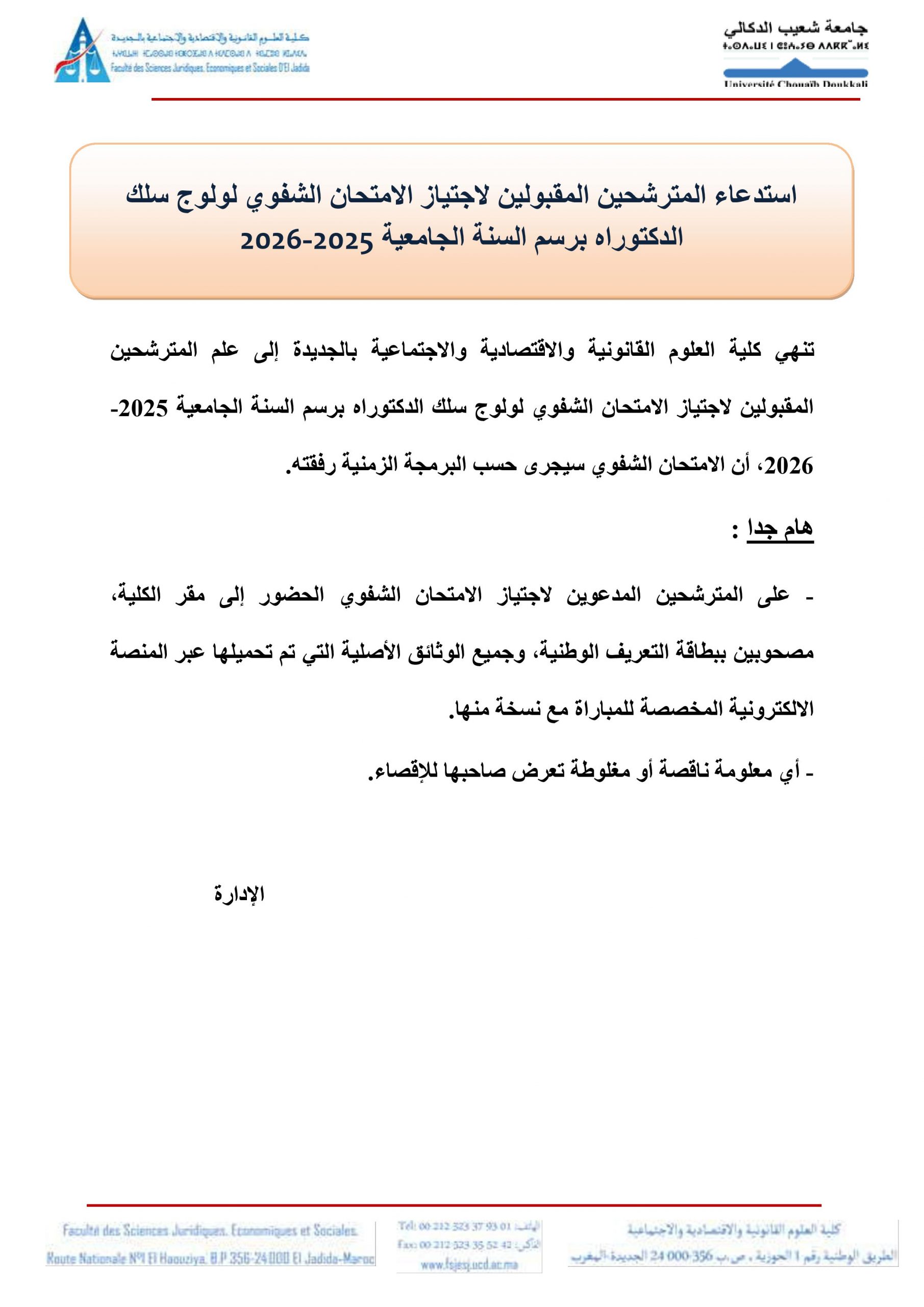 استدعاء المترشحين المقبولين لاجتياز الامتحان الشفوي لولوج سلك الدكتوراه برسم السنة الجامعية 2026-2025