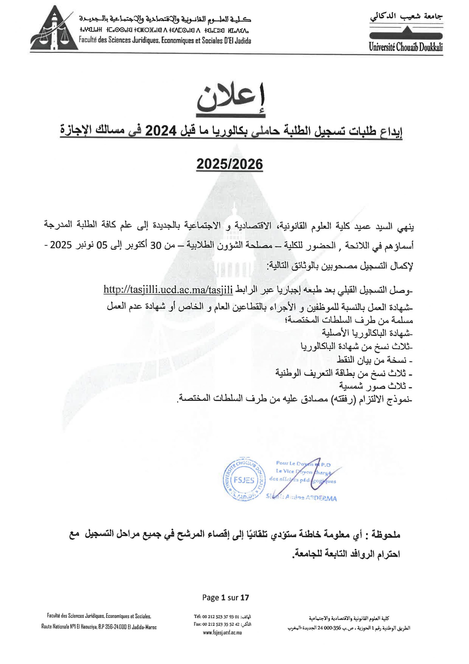 إعلان للمترشحين المقبولين لولوج مسالك الماستر » DAE, GDGL, DAIPP, Oct 23, 2025إعلان للمترشحين المقبولين لولوج مسالك الماستر » DAE, GDGL, DAIPP, lire plus