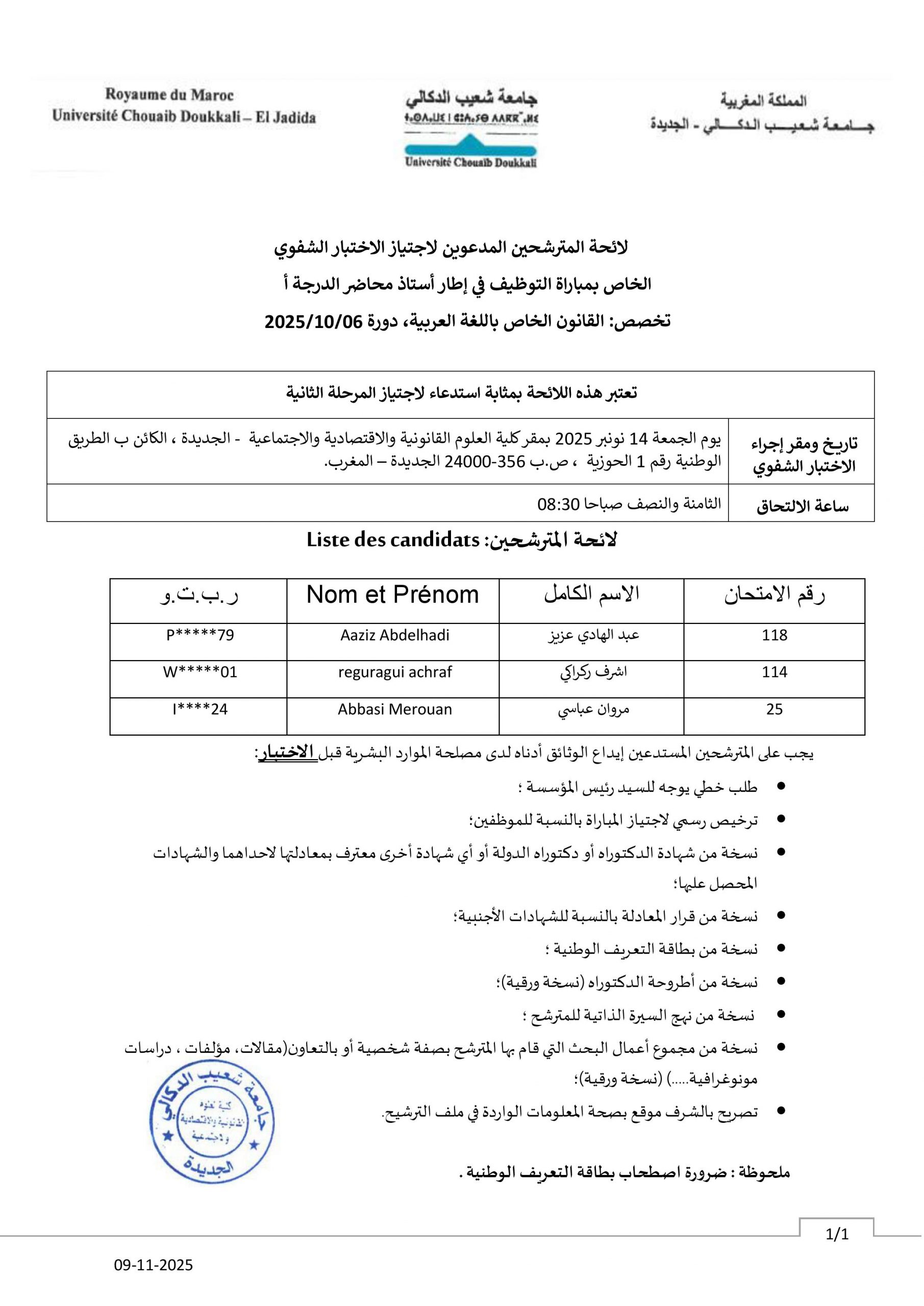 لائحة المترشحين المدعوين لاجتياز الاختبار الشفوي الخاص بمباراة التوظيف في إطار أستاذ محاضر الدرجة أ تخصص: القانون الخاص باللغة الفرنسية، دورة 06/10/2025