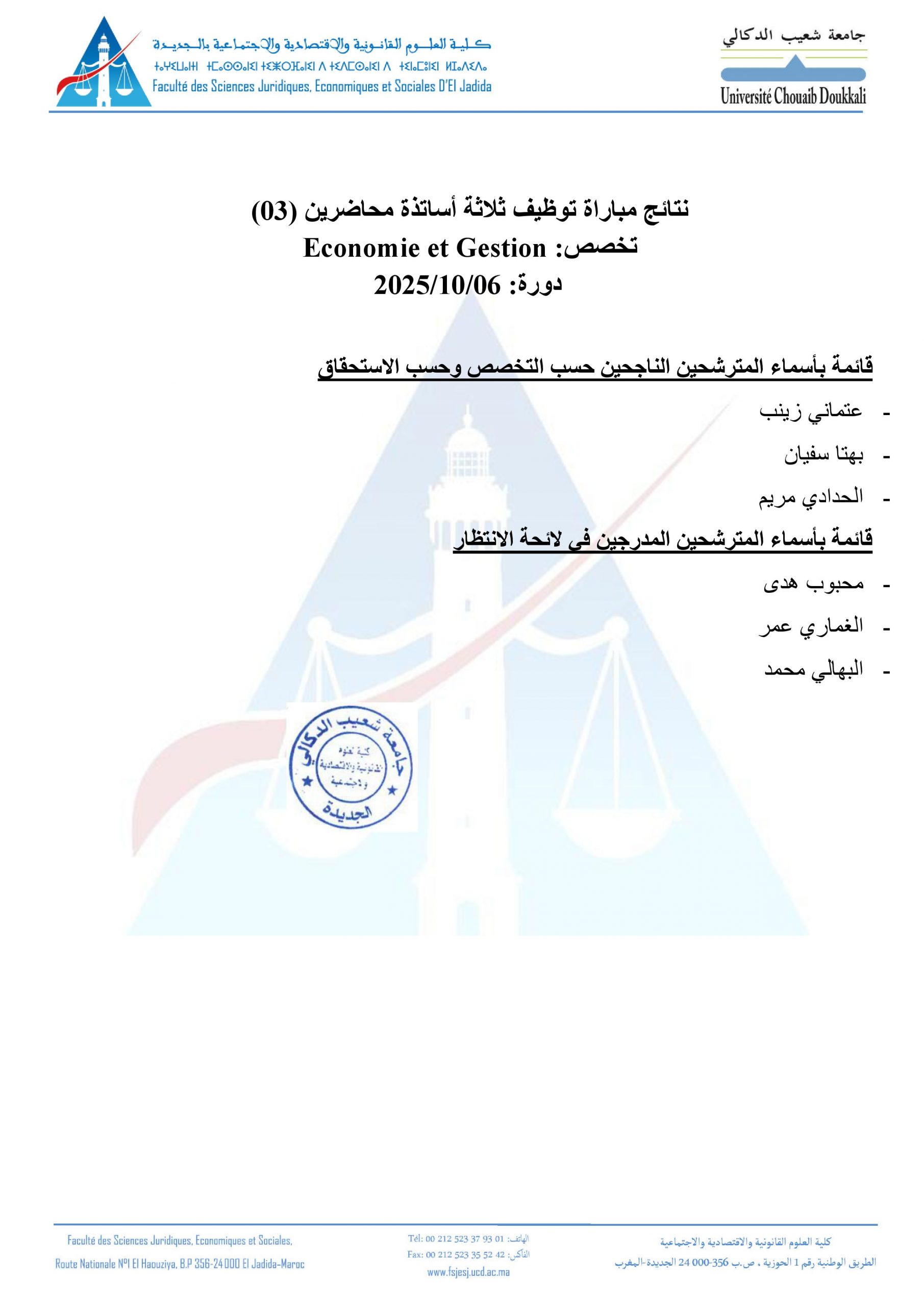لائحة المترشحين المدعوين لاجتياز الاختبار الشفوي الخاص بمباراة التوظيف في إطار أستاذ محاضر الدرجة أ تخصص: القانون الخاص باللغة العربية، دورة 29/11/2025