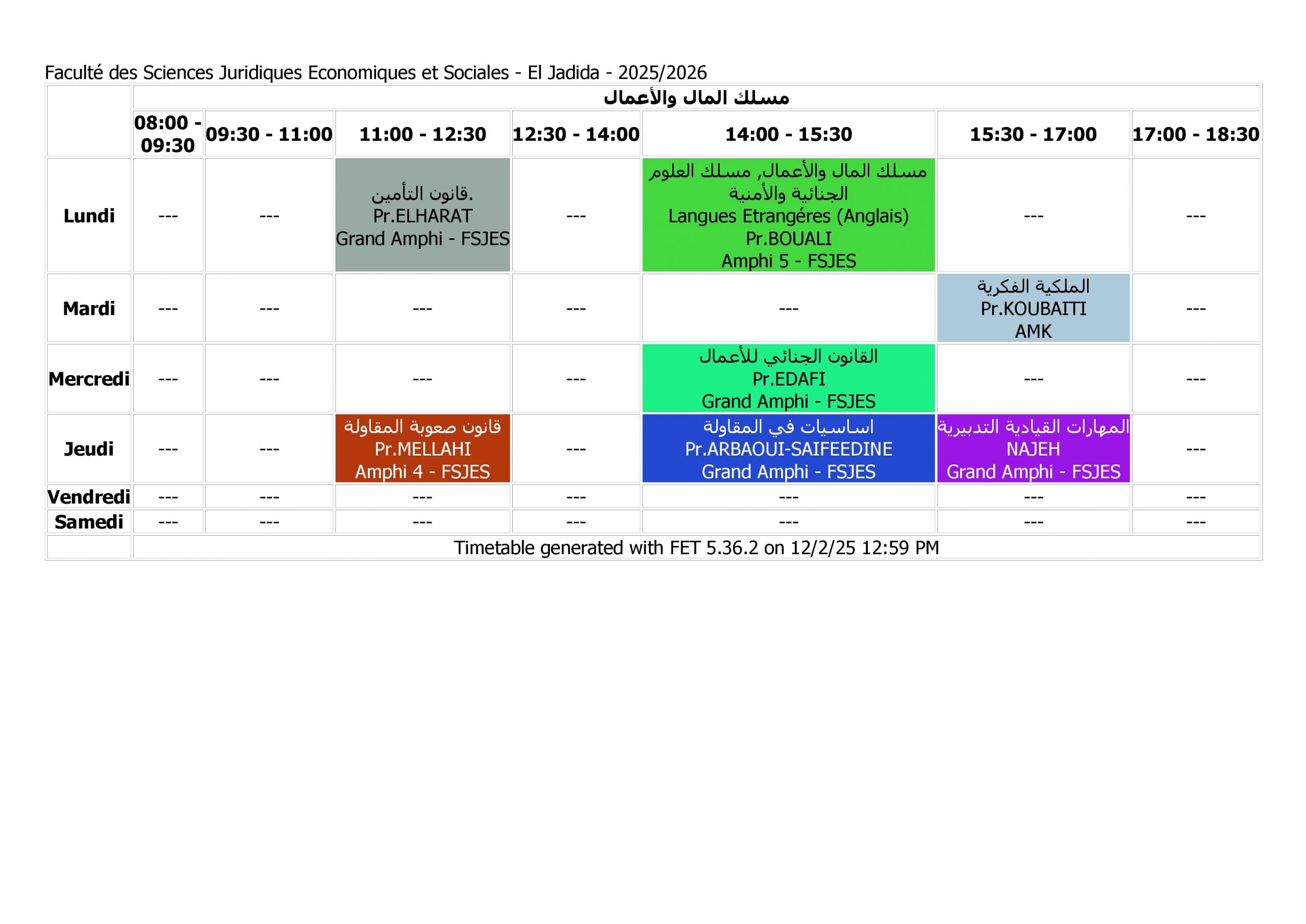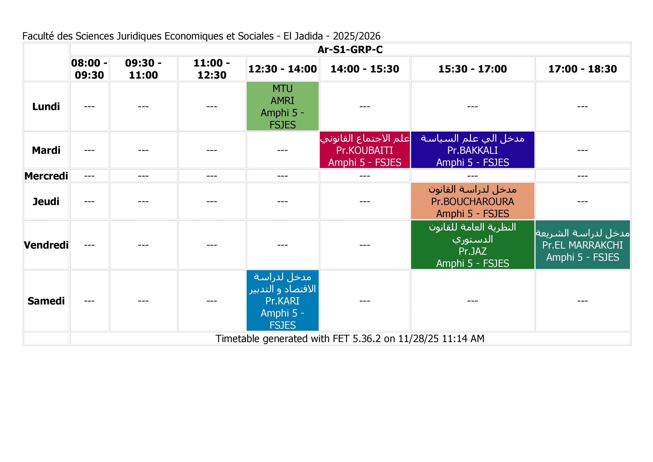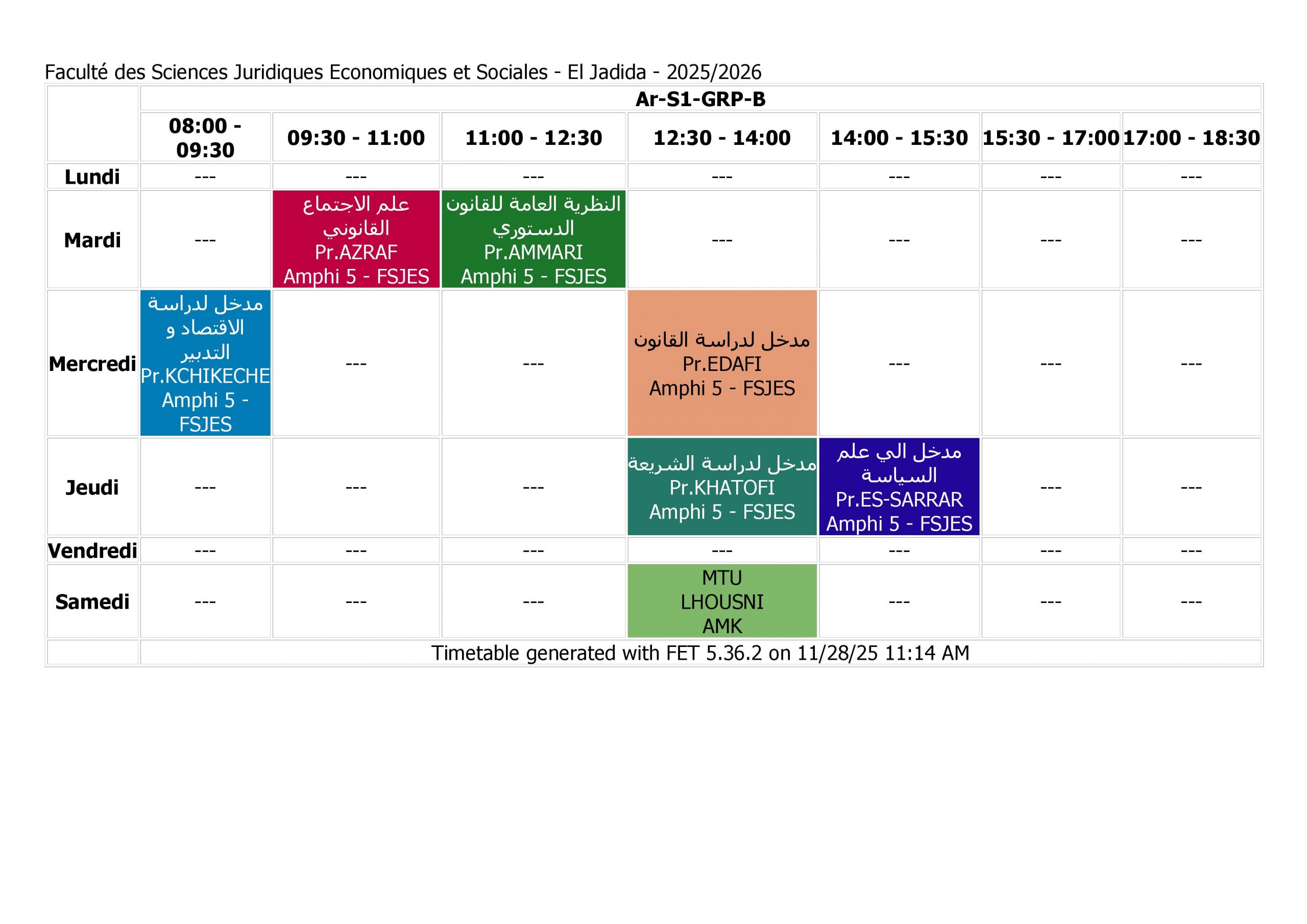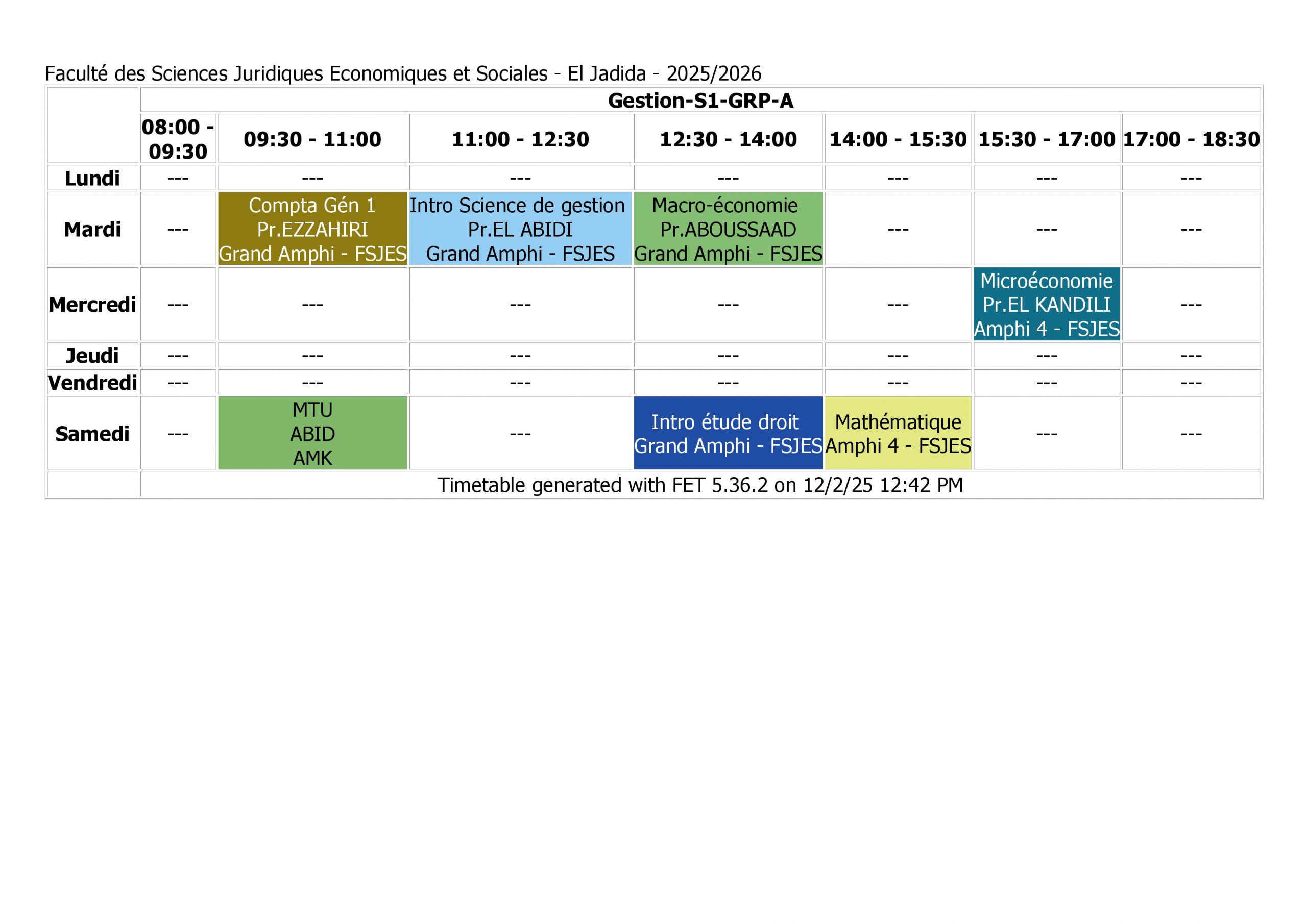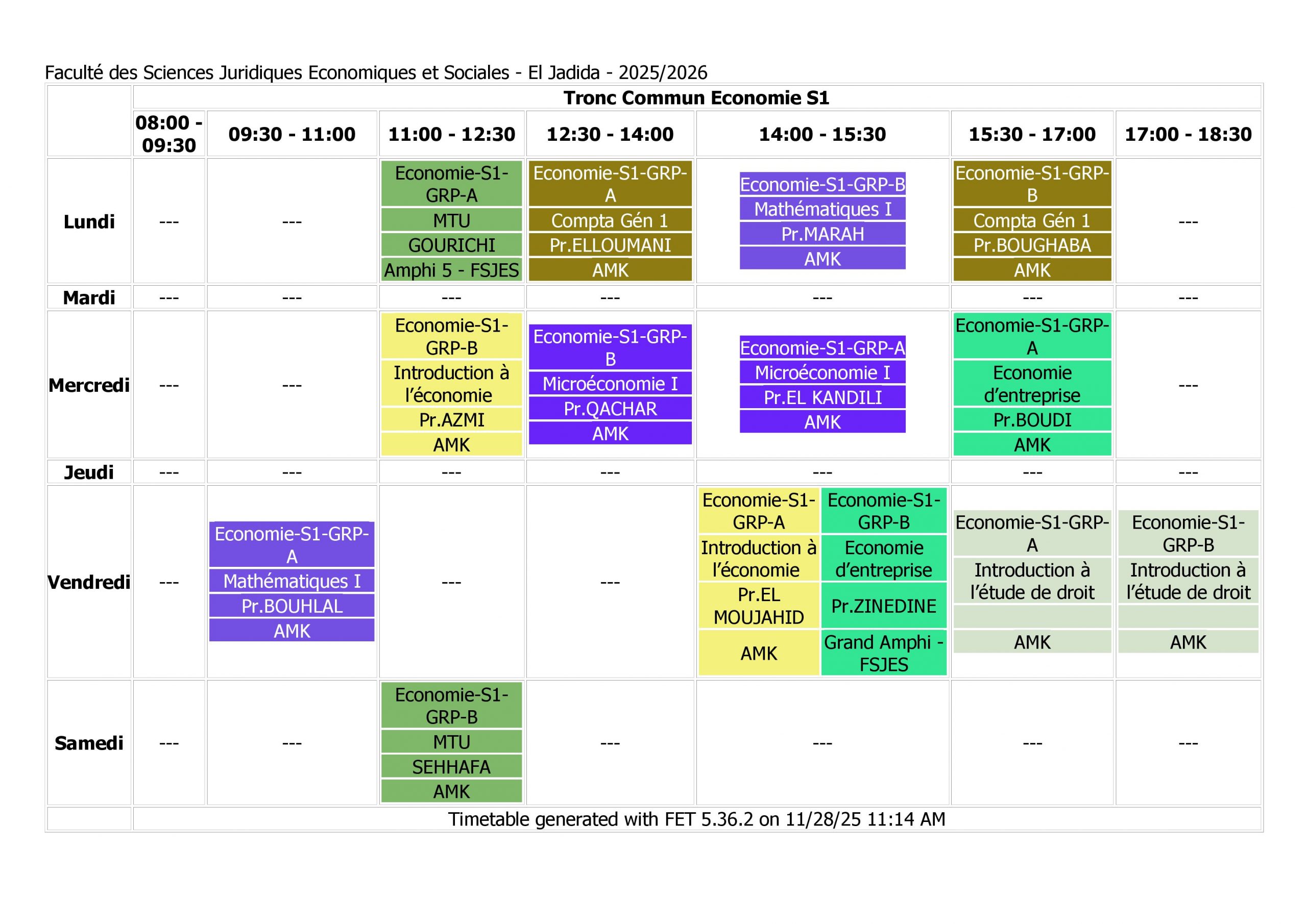 Emplois du Temps 2025/2026 Sciences Economiques et Gestion Gestion S1 A Gestion S1 B Gestion S1 C Economie S1 Gestion S3 Economie S3 Gestion Financière Et Fiscale Management Des Ressources Humaines Marketing & Actions Commerciales Techniques De Banque Et Assurance Econométrie Appliquée Economie Internationale Et Logistique Droit en Langue Française S1 Tronc commun : Droit privé et Droit public S3 Tronc commun : Droit privé et Droit public Droit Financier Et Des Affaires Etudes Politiques Et Internationales جذع مشترك قانون خاص و قانون عام S1 قانون خاص A الفوج S1 قانون خاص B الفوج S1 قانون خاص C الفوج S1 قانون عام D الفوج S3 قانون المال والأعمال المهن القانونية والقضائية العلوم الجنائية و الأمنية المنازعات العمومية والتدقيق المالي والهندسة الضريبية الإدارة والتنمية Licence Parcours d’Excellence DAFF Masters 1ère année IMQ CCA MRH IFFP DAE GDGL DAIPP Masters 2ème année IMQ CCA MRH IFFP GDGL DAE DAIPP