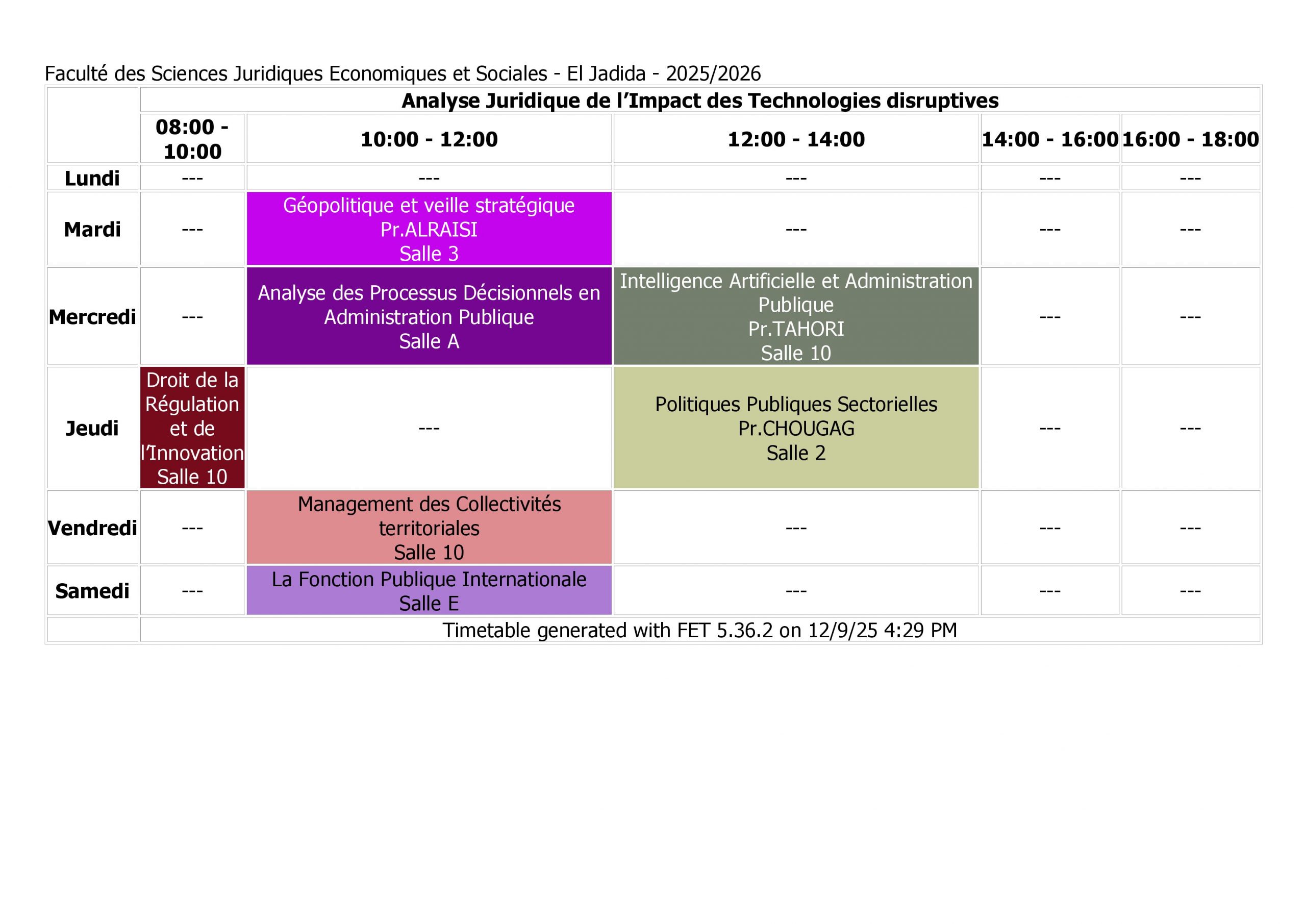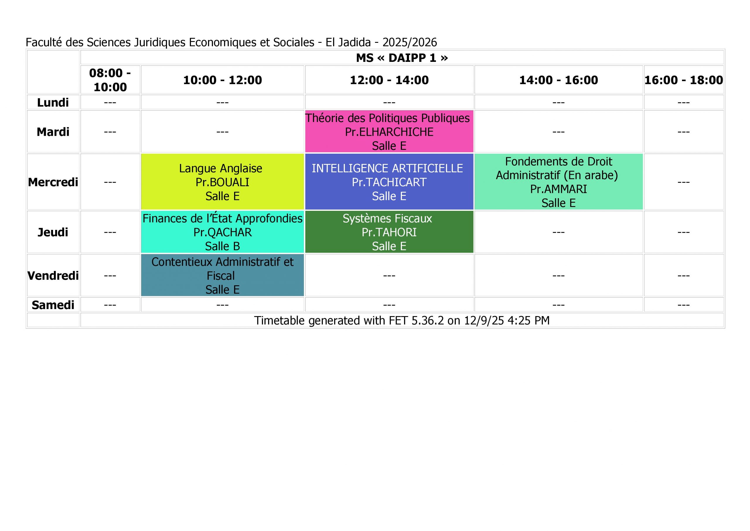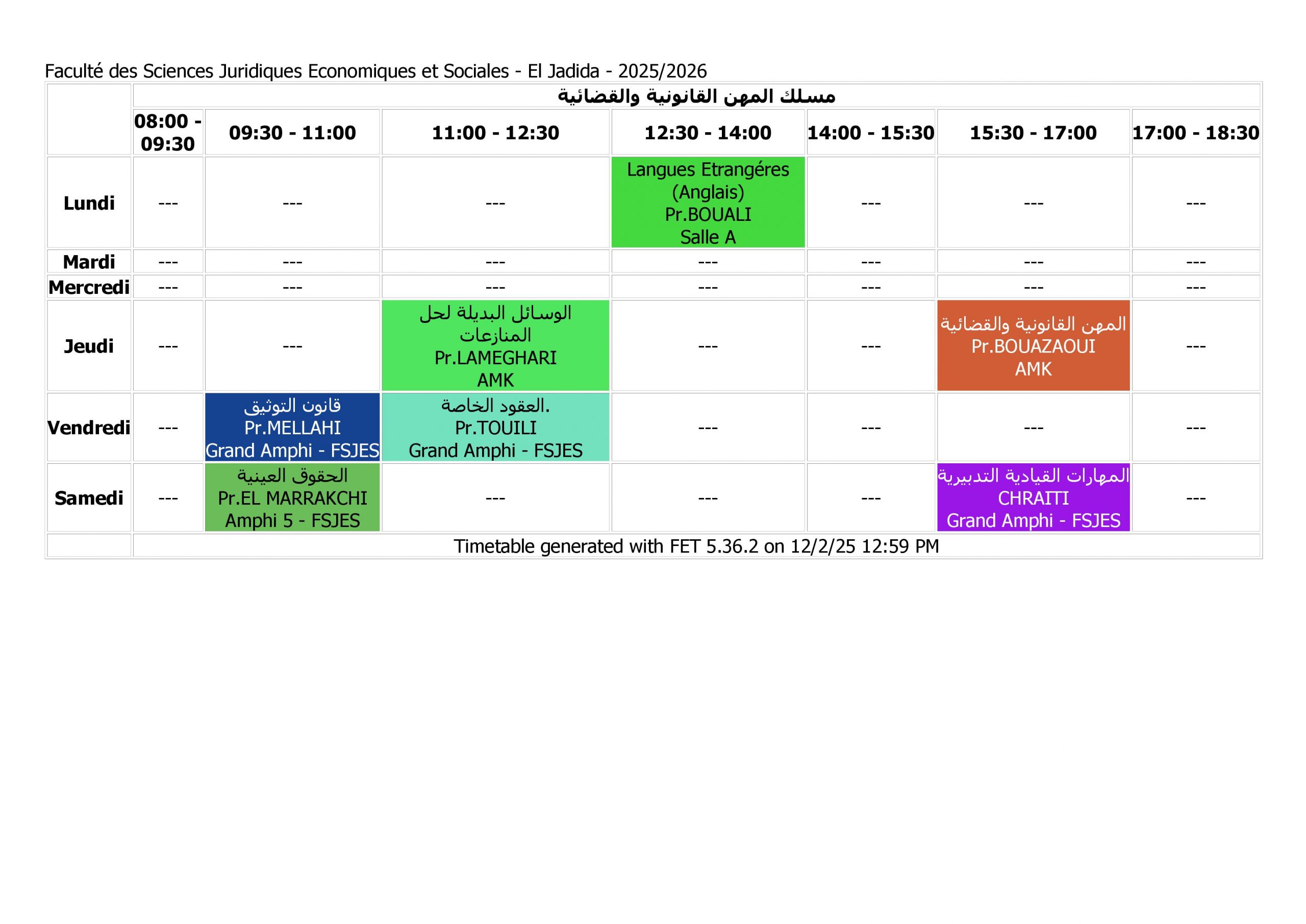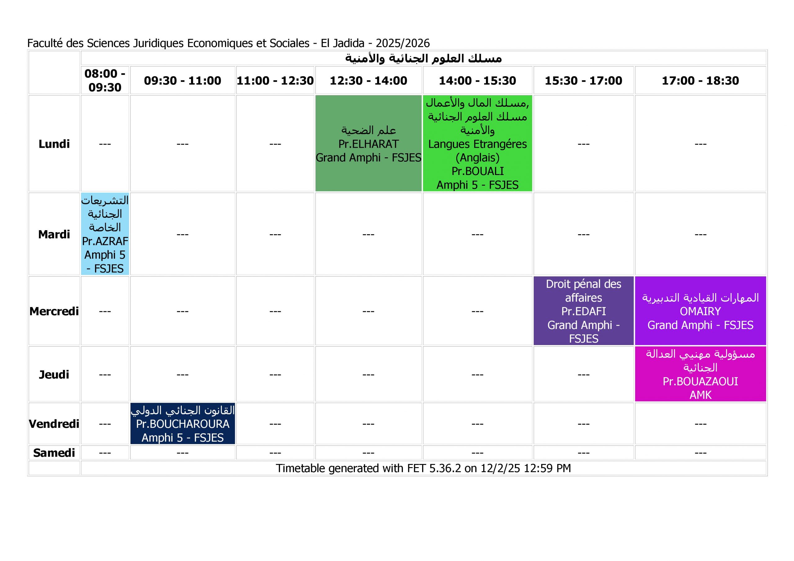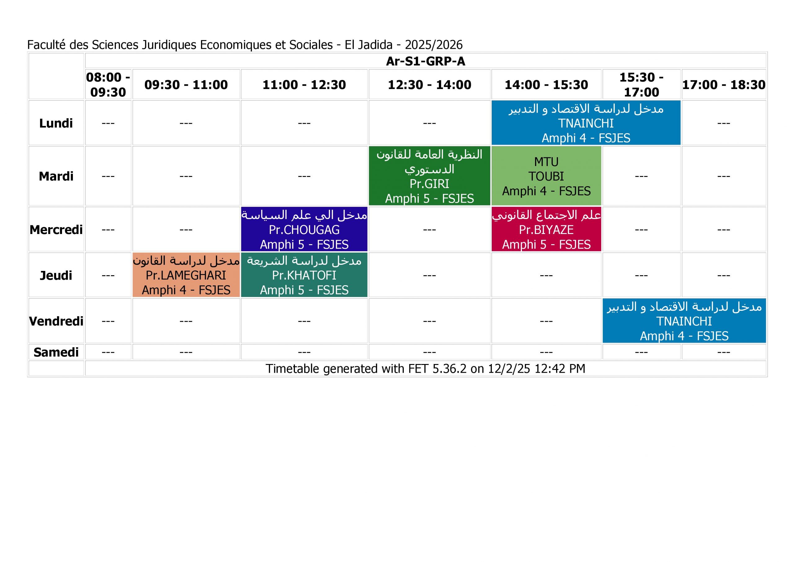 Emplois du Temps 2025/2026 Sciences Economiques et Gestion Gestion S1 A Gestion S1 B Gestion S1 C Economie S1 Gestion S3 Economie S3 Gestion Financière Et Fiscale Management Des Ressources Humaines Marketing & Actions Commerciales Techniques De Banque Et Assurance Econométrie Appliquée Economie Internationale Et Logistique Droit en Langue Française S1 Tronc commun : Droit privé et Droit public S3 Tronc commun : Droit privé et Droit public Droit Financier Et Des Affaires Etudes Politiques Et Internationales جذع مشترك قانون خاص و قانون عام S1 قانون خاص A الفوج S1 قانون خاص B الفوج S1 قانون خاص C الفوج S1 قانون عام D الفوج S3 قانون المال والأعمال المهن القانونية والقضائية العلوم الجنائية و الأمنية المنازعات العمومية والتدقيق المالي والهندسة الضريبية الإدارة والتنمية Licence Parcours d’Excellence DAFF Masters 1ère année IMQ CCA MRH IFFP DAE GDGL DAIPP Masters 2ème année IMQ CCA MRH IFFP GDGL DAE DAIPP